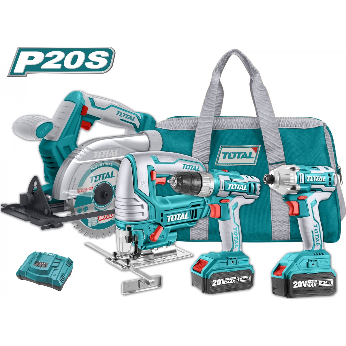 TOTAL TCKLI2010 Δραπανοκατσάβιδο + παλμικό κατασαβίδι + σέγα + δισκοπρίονο μπαταρίας λιθίου 20V / 4Ah επαγγελματικό σέτ