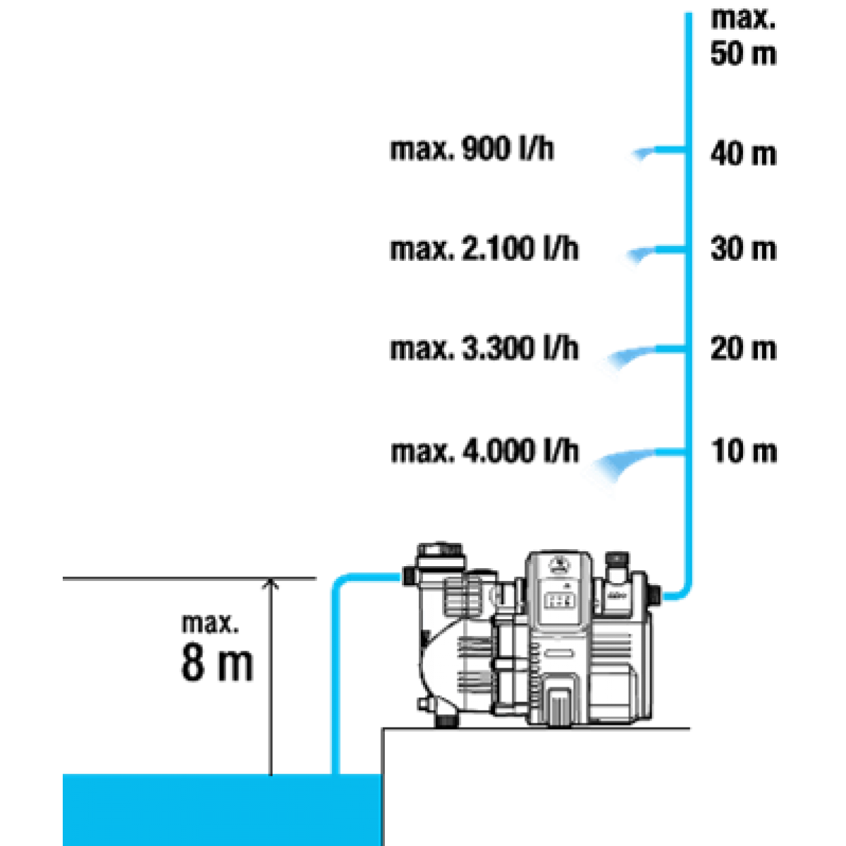 - Διάφορες πληροφορίες σχετικά με την πίεση, την παροχή ή τις πιθανές δυσλειτουργίες και την εξάλειψή τους μπορούν εύκολα να προσεγγιστούν με το πάτημα ενός δακτύλου. Η έξυπνη (smart) αυτή αντλία είναι εξοπλισμένη με μια αντλία τύπου jet, η οποία αντλεί το νερό γρήγορα, αξιόπιστα και αθόρυβα. Η βαλβίδα αντεπιστροφής, με την οποία είναι εφοδιασμένη, εγγυάται γρήγορη αναρρόφηση.
