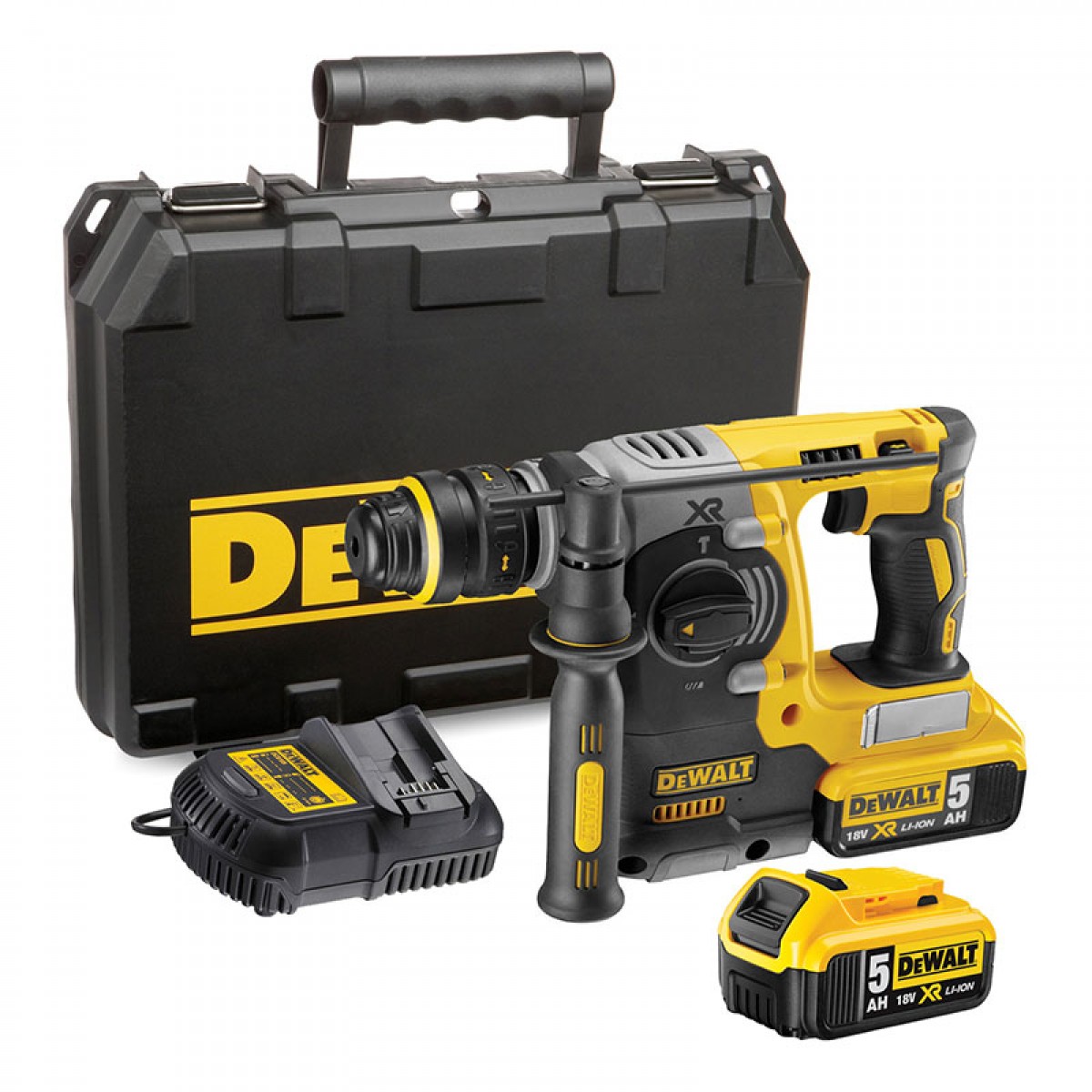 2 x 5.0Ah XR Μπαταρίες λιθίου με φωτεινή ένδειξη, Πολυφορτιστής XR, Γάντζος ζώνης, Πλευρική λαβή πολλαπλών θέσεων, Ανθεκτική θήκη μεταφοράς
