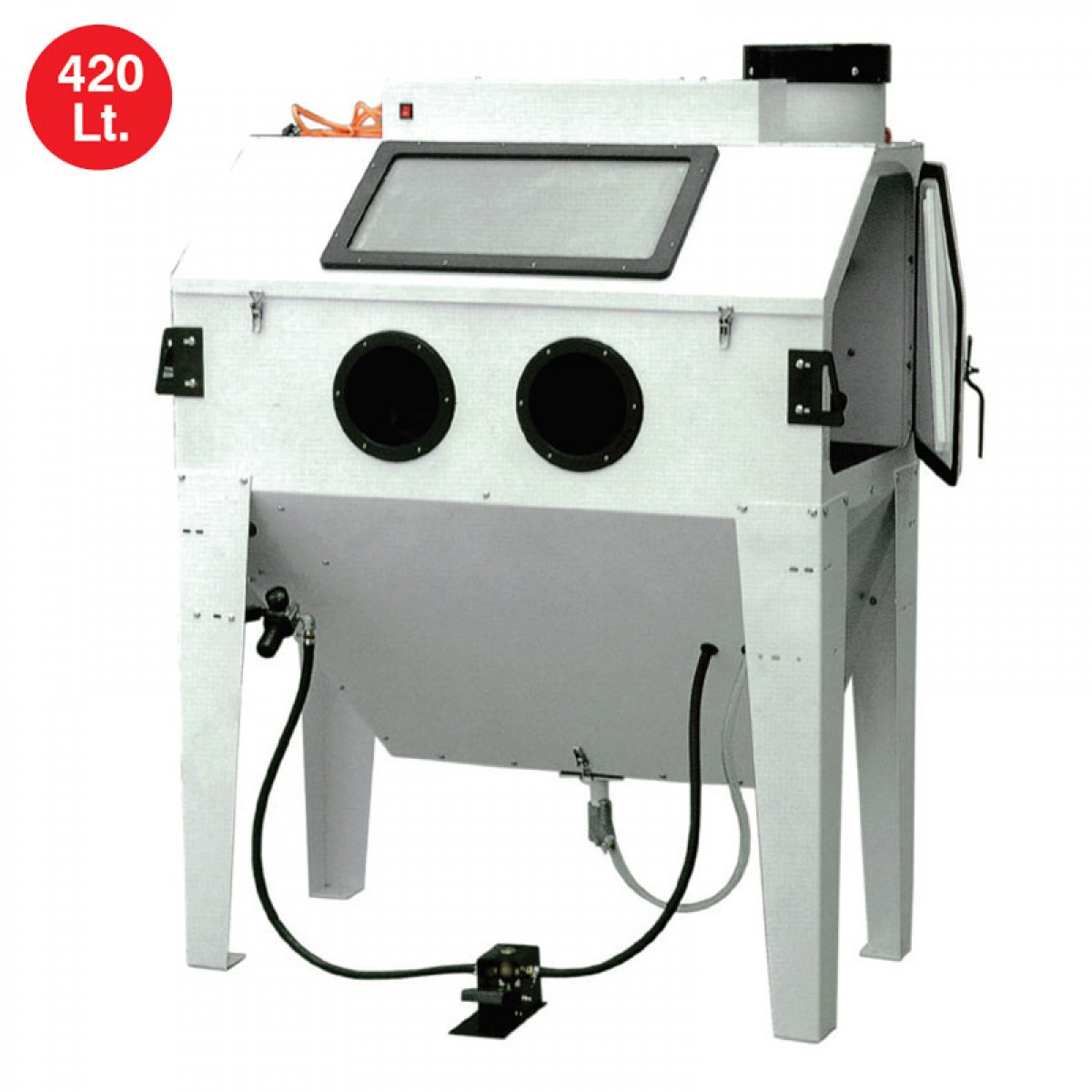 Επαγγελματική καμπίνα αμμοβολής 420 Lt με 2 πλαϊνά πορτάκια, ανοιγόμενη πάνω θυρίδα(καπάκι) και εσωτερικό φώς.