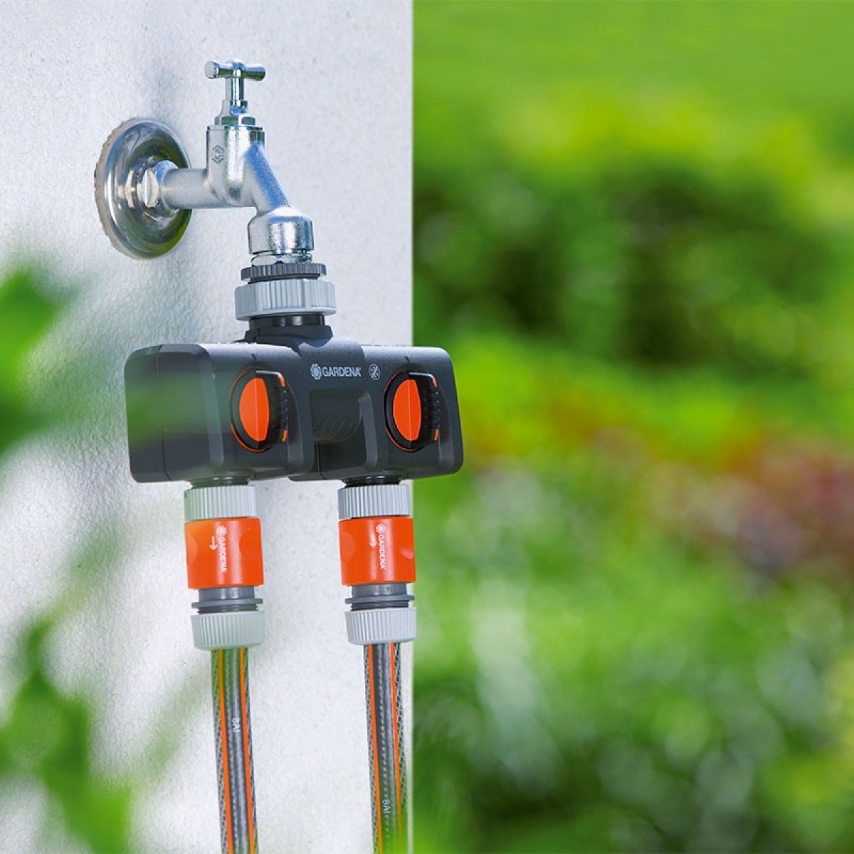 Με τη Διπλή Παροχή της GARDENA είναι εφικτή η ταυτόχρονη σύνδεση δύο ποτιστικών συσκευών σε μία βρύση. Οι έξοδοι είναι πλήρως ρυθμιζόμενες.