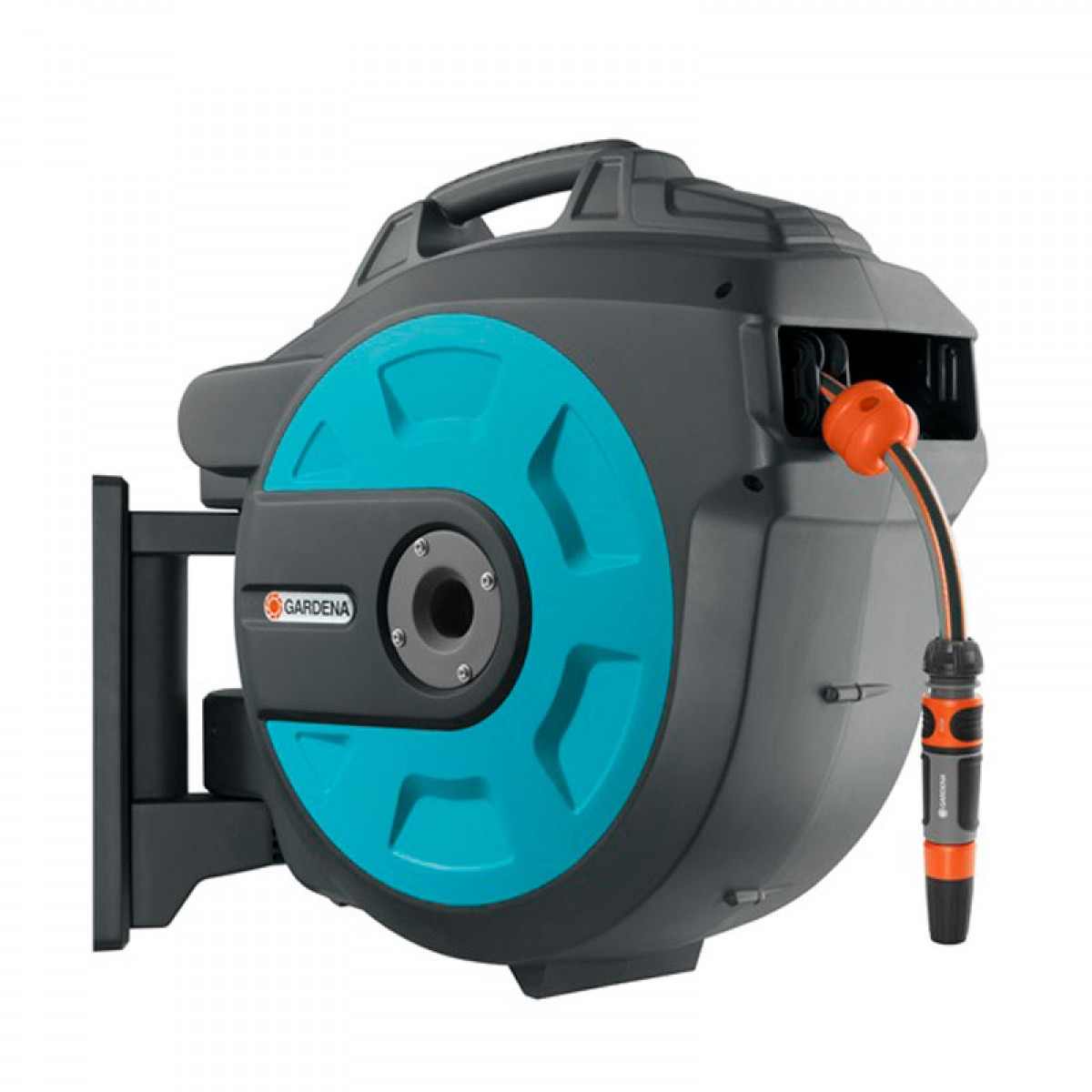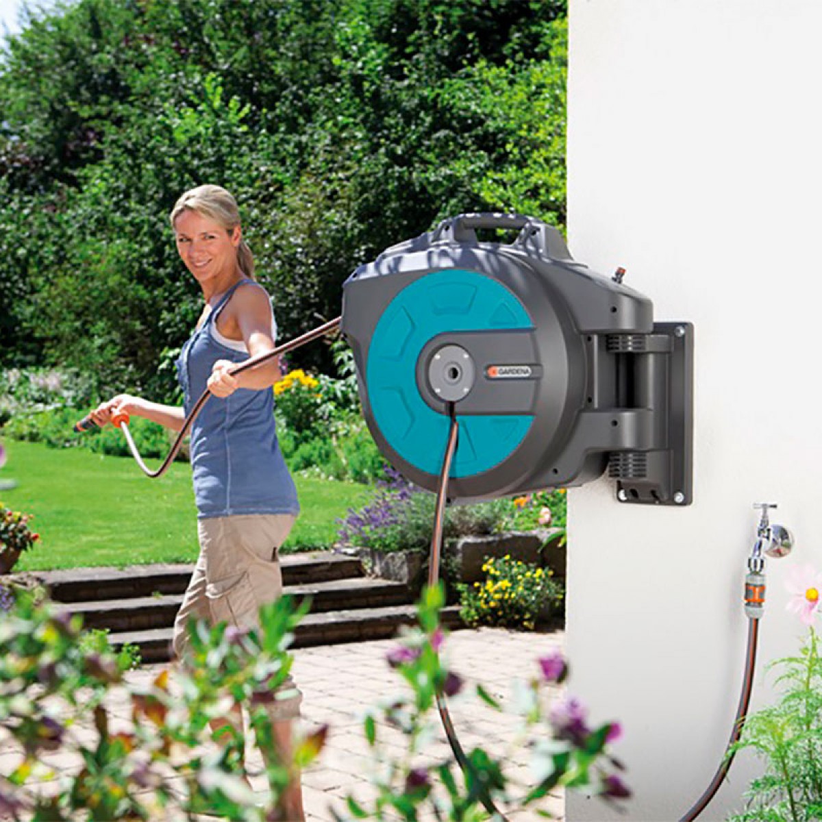 Το καρούλι τοίχου είναι εξοπλισμένο με 25 m λάστιχο υψηλής ποιότητας, 2 m λάστιχο σύνδεσης, ένα πλήρως ρυθμιζόμενο ακροφύσιο (Κωδ. 8114) και όλα τα απαραίτητα εξαρτήματα σύνδεσης του αυθεντικού συστήματος GARDENA: τρία ρακόρ (Κωδ. 900, 901, 902), έναν κλασικό ταχυσύνδεσμο (Κωδ. 915) και έναν ταχυσύνδεσμο στοπ (Κωδ. 913).