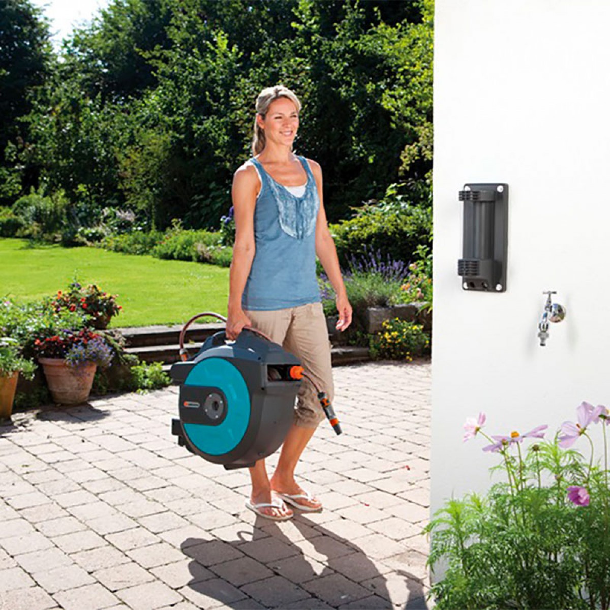 Το Αυτόματο Καρούλι Λάστιχου Roll Up 25 της GARDENA καθιστά το πότισμα ιδιαίτερα εύκολο και βολικό.