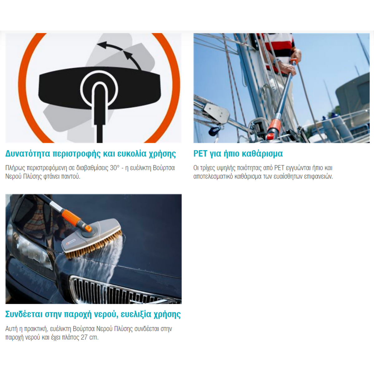 Αυτή η Βούρτσα Νερού Πλύσης, με δυνατότητα σύνδεσης στην παροχή νερού και στο Original GARDENA System είναι κατασκευασμένη από υλικό υψηλής ποιότητας τρίχες από PET.