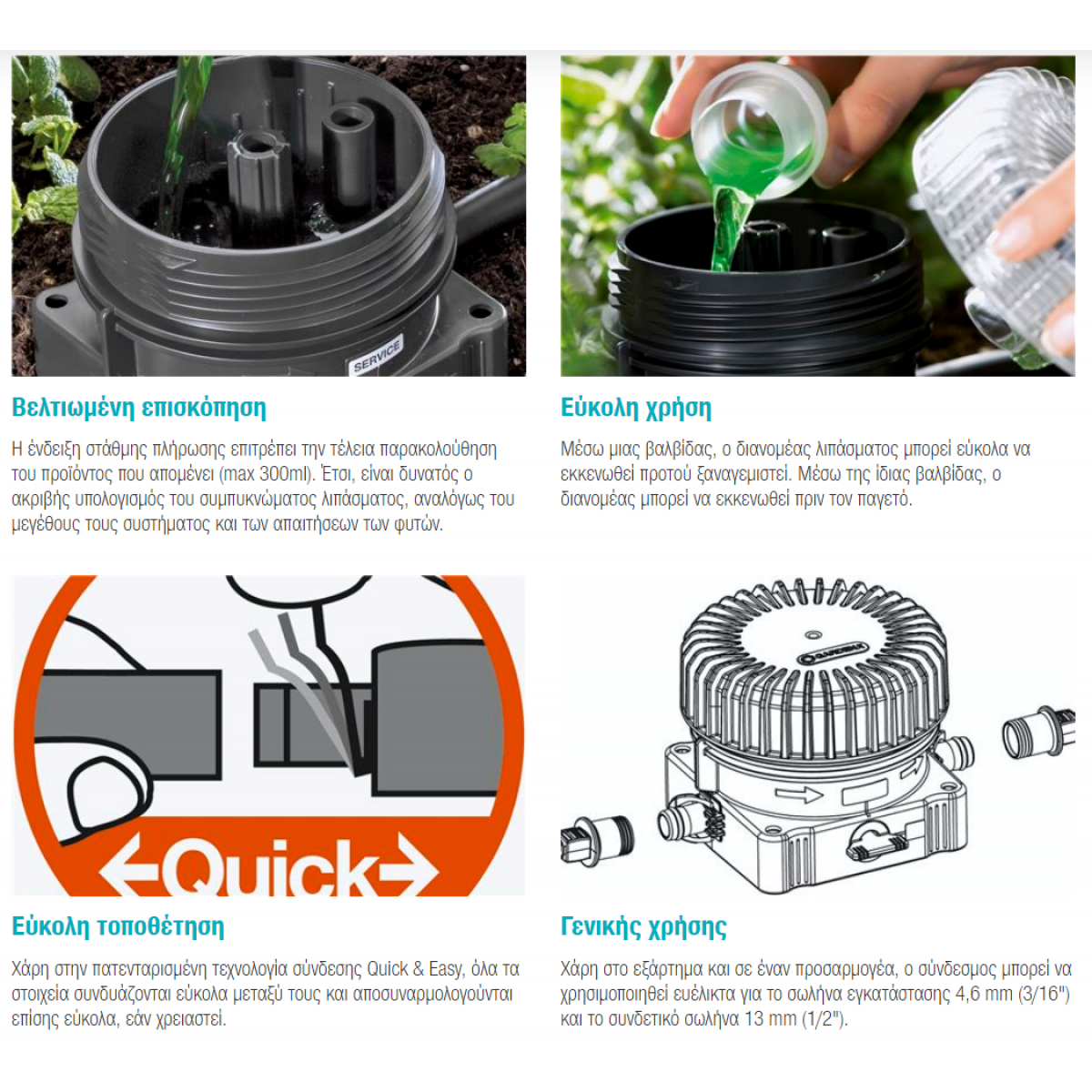 Ο Διανομέας Λιπάσματος GARDENA είναι ιδανικός για την προσθήκη του υγρού λιπάσματος γενικής χρήσης GARDENA (Κωδ. πρ. 8303-20) στο GARDENA Micro-Drip-System.