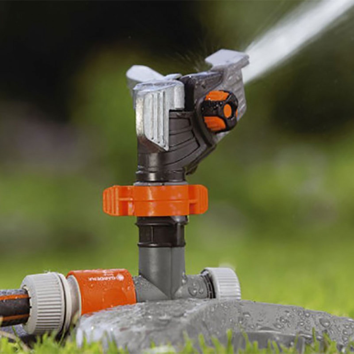 Η Κεφαλή Παλμικού Μπεκ Κύκλου/Ημικυκλίου Premium της GARDENA μπορεί εύκολα να βιδωθεί σε τρίποδο ή στο λάστιχο ποτίσματος.