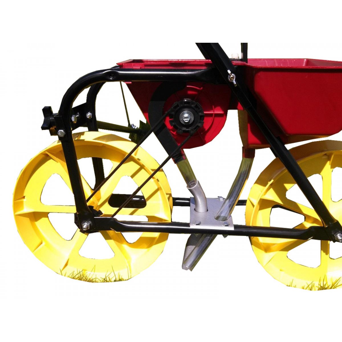 Σπαρτική Αμερικής τύπου ποδηλάτου υψηλής αντοχής πλαίσιο και σωλήνας σποράς από χάλυβα δεν χρειάζεται εργαλεία για συναρμολόγηση. Έχει 2 δοχεία το ένα δίπλα στο άλλο ένα για λίπανση χωρητικότητας 3,5kg και ένα για σπόρο. Ο οπίσθιος τροχός έχει κίνηση μέσω ιμάντα για καλύτερη σπορά. Ρυθμιζόμενο βάθος σποράς. 6 διαφορετικοί δίσκοι σποράς για 31 διαφορετικές ποικιλίες σπόρων. Περιλαμβάνει πρόσθετη θήκη. Διαστάσεις 76 x 38 x 104cm. Βάρος 6,3kg.