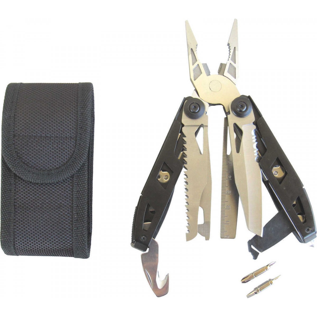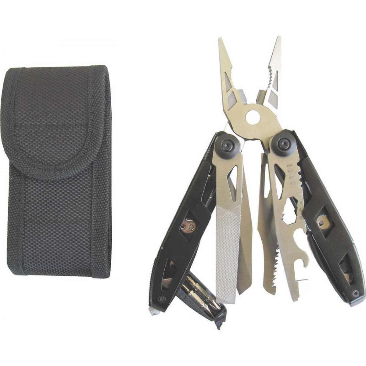 Περιέχει πένσα, μαχαίρι, πριόνι, κόφτη, ανοιχτήρια κονσερβών και μπουκαλιών, γερμανικά κλειδιά, λίμα, χάρακα, κατσαβίδια, εργαλείο θραύσης τζαμιών, κόφτη ζώνης αυτοκινήτου και ότι μπορεί να χρειαστείτε στο σπίτι ή στο αυτοκίνητο.