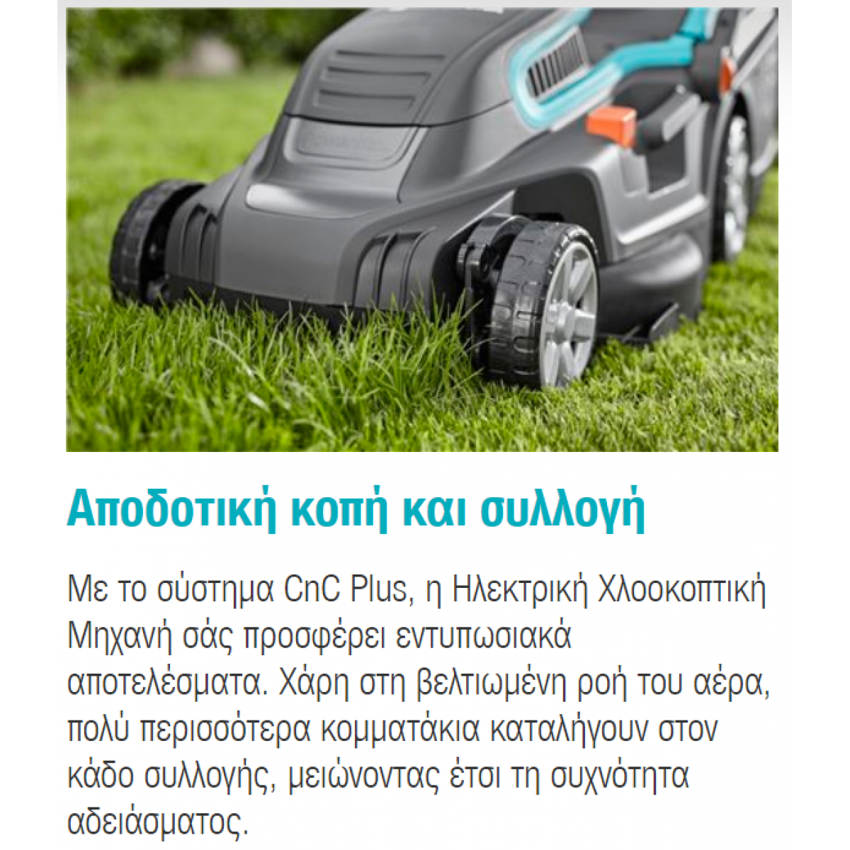 Η πανίσχυρη Ηλεκτρική Χλοοκοπτική Μηχανή PowerMax™ 1800/42 της GARDENA είναι ιδανική για τη φροντίδα μεγάλων εκτάσεων χλοοτάπητα. Η επισκληρυμένη λεπίδα DuraEdge προσφέρει εξαιρετικά αποτελέσματα κοπής. Η λαβή ErgoTec Plus είναι ιδιαίτερα άνετη στο κράτημα και κάνει την ώθηση εξαιρετικά εύκολη. Η λειτουργία QuickFit Plus εξασφαλίζει εύκολη κεντρική ρύθμιση του ύψους κοπής σε 5 στάδια. Τα χτενάκια στα πλάγια διευκολύνουν την κοπή κοντά σε τοίχους και πεζούλια. Το σύστημα CnC Plus προσφέρει βέλτιστη κοπή και συλλογή και μειώνει τη συχνότητα αδειάσματος του κάδου. Ο τηλεσκοπικός άξονας και η αναδιπλούμενη χειρολαβή διευκολύνουν τη ρύθμιση στο ύψος του χρήστη, τη μεταφορά, αλλά και την αποθήκευση.