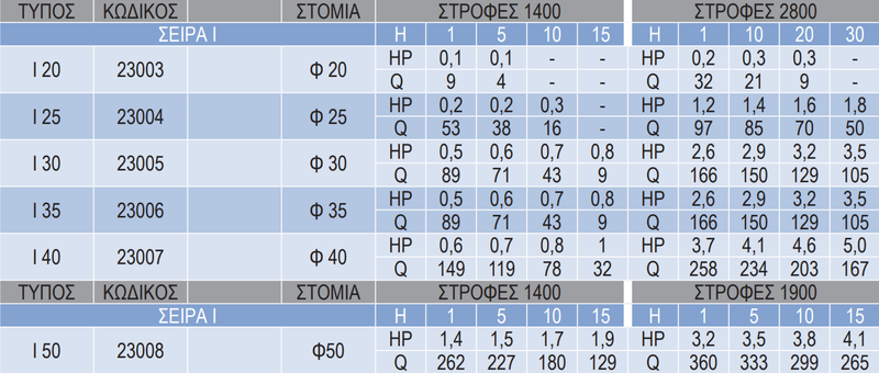 Ίπποι : 15HP Παροχή νερού (max) : 8,5 κυβικά/ώρα => Mέτρα (max): 136 m Παροχή νερού (max) : 12 κυβικά/ώρα => Mέτρα (max): 129 m Παροχή νερού (max) : 15 κυβικά/ώρα => Mέτρα (max): 120 m Πα..