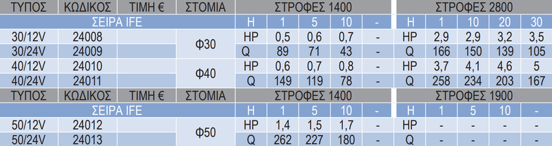 Ισχύς: 300 Watt – 0.40Hp Τάση λειτουργίας: 220V Μέγιστo μανομετρικό: 7.7m Μέγιστο παροχή: 116lt/min Μέγιστο βάθος αναρρόφησης: 3.5m Στόμιο: 1 1/2” Φτερωτή: 1 Θερμοκρασία υγρών: έως +3..