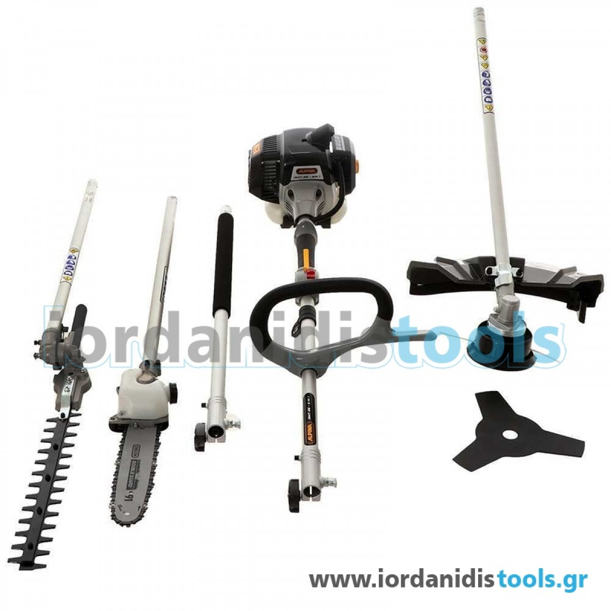 Ένα ευέλικτο και αποτελεσματικό δίχρονο πολυεργαλείο απο την ALPINA, για διαφορετικές εργασίες στον κήπο: εξοπλισμένο με εξάρτημα πριόνι (κονταροπρίονο), ψαλίδι μπορντούρας, χορτοκοπτικό με δίσκο ή αυτόματη κεφαλή και επιπλέον προέκταση κονταριού 0,70μ ώστε να φτάσει το συνολικό μήκος των 2,59 μέτρων!!