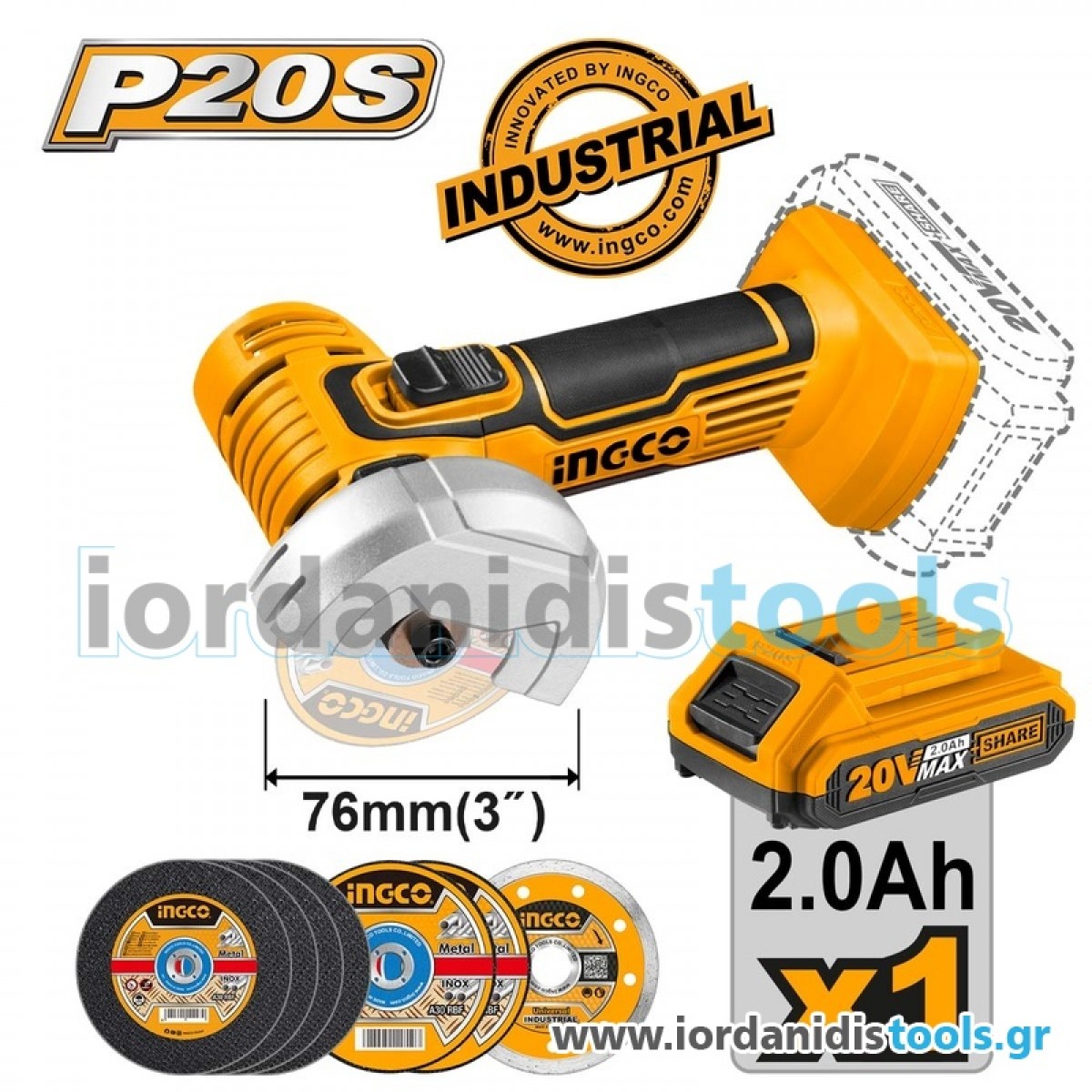 INGCO Μίνι Τροχός Κοπής Μπαταρίας 76mm 20V Li-Ion