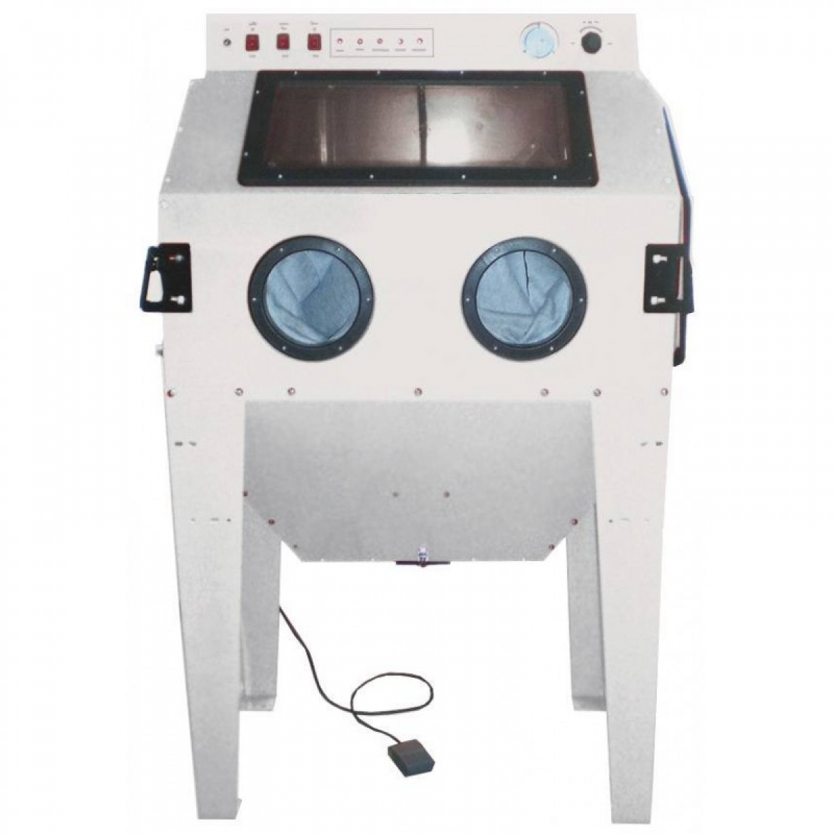 Επαγγελματική καμπίνα αμμοβολής 350lt με πλαϊνό πορτάκι και ενσωματωμένο πίνακα με ρύθμιση πίεσης και μανόμετρο. Διαθέτει φωτισμό και ποδοπεντάλ.
