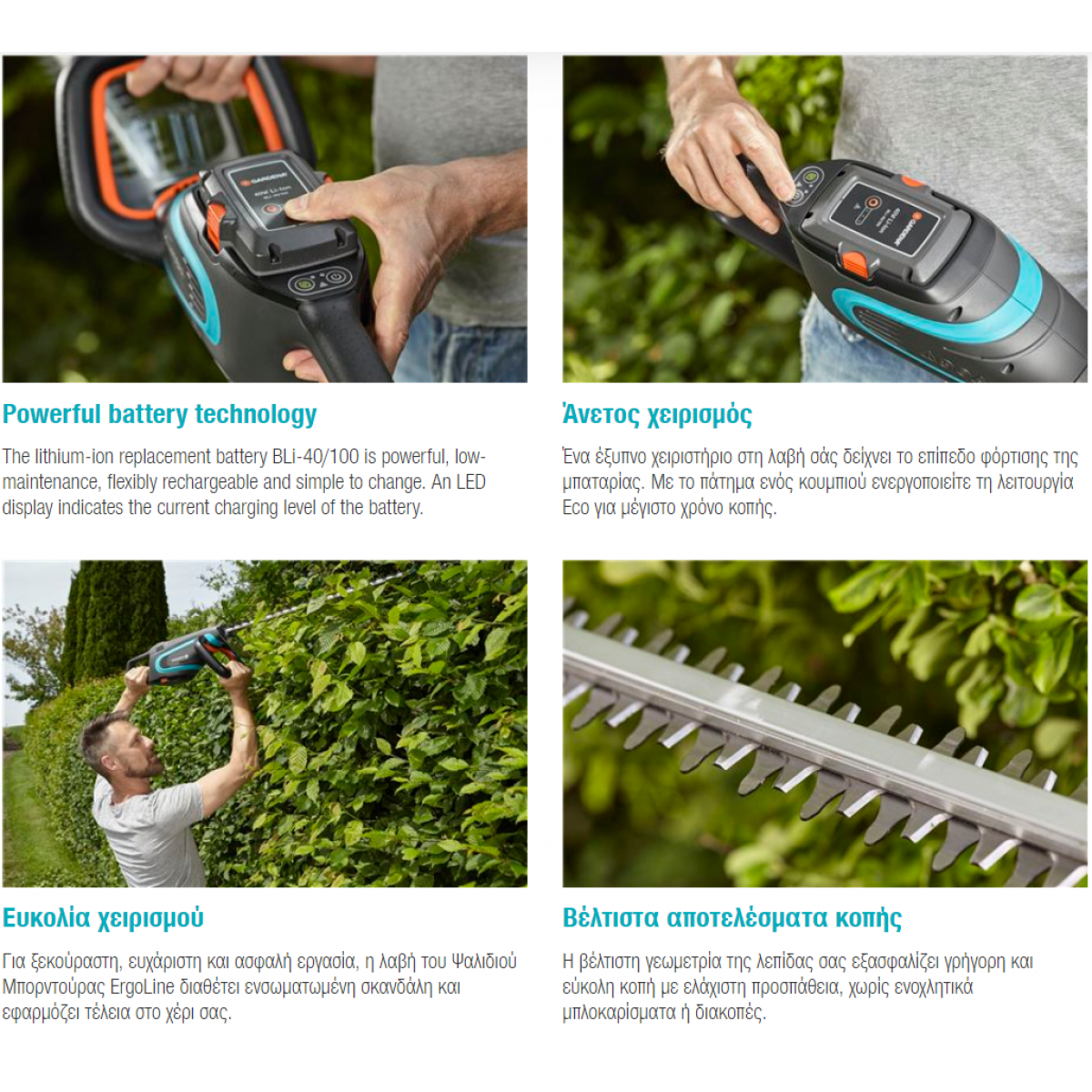 Το ψαλίδι μπορντούρας τροφοδοτείται με το εύκολο στη συντήρηση σύστημα μπαταρίας GARDENA με 40 V* και 2,6 Ah.