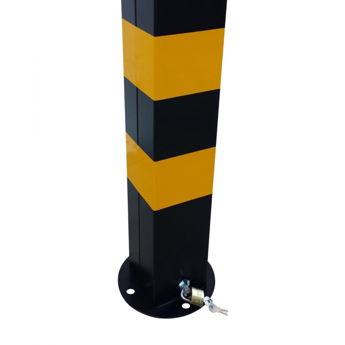 Μεταλλικό κολωνάκι με λουκέτο, με πυραμιδικό τελείωμα και κρίκο κατάλληλο για πλαστική αλυσίδα. Τετραγωνικής διατομής, 100Χ100mm και 520mm ύψος. Γαλβανιζέ, βαμμένο ηλεκτροστατικά, με ενισχυτικά νεύρα εσωτερικά και ανακλαστικές ταινίες.