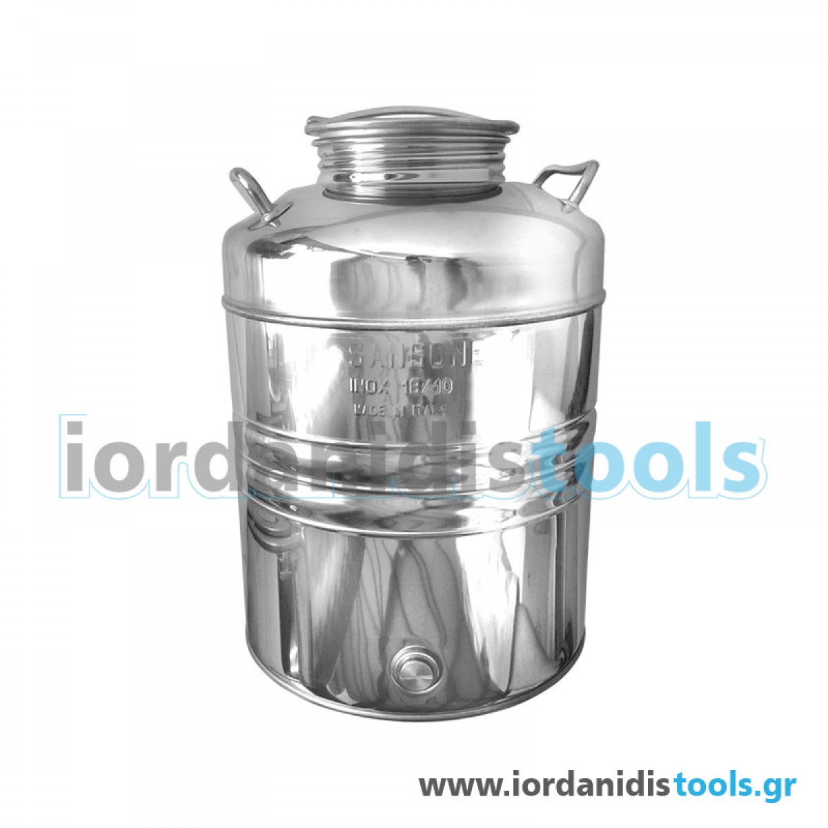 Δοχείο ανοξείδωτου χάλυβα (Το υλικό που χρησιμοποιείται είναι ανοξείδωτο ατσάλι 18/10 - Aisi 304 (DIN 1,4301) με βιδωτό καπάκι και κάνουλα γαλβανιζέ, ιδανικό για μακροχρόνια και ασφαλή αποθήκευση ελαιόλαδου. Προσφέρεται επίσης για την αποθήκευση και άλλων υγρών τροφίμων όπως νερό, ξύδι, κρασί, κλπ. Διαθέτει καπάκι βιδωτό και χειρολαβές. Τα δοχεία φέρουν το σήμα "ποτήρι-πιρούνι" που αποτελεί ένδειξη της καταλληλότητας των για αποθήκευση τροφίμων. Το τάπωμα, το οποίο είναι εξοπλισμένο με ένα ειδικό για τρόφιμα λάστιχο σιλικόνης, επιτρέπει την εύκολη και ασφαλή μεταφορά.