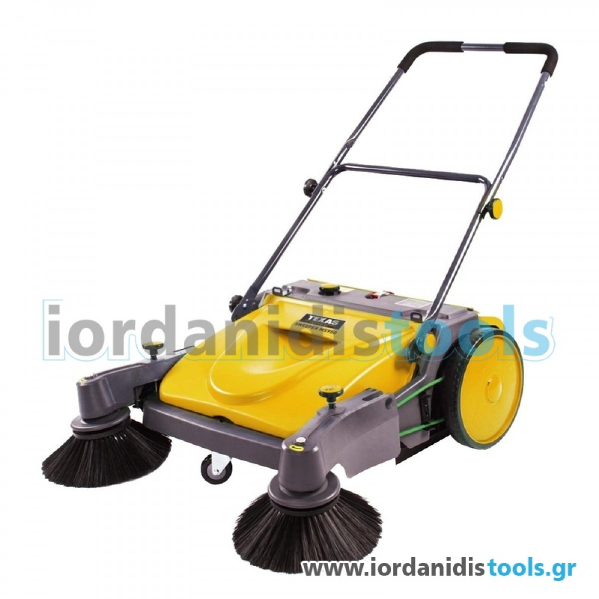 Σκούπα χειροκίνητη με δύο βούρτσες, πλάτος εργασίας 95cm, κάδος συλλογής 45lit. Βάρος 25kg.