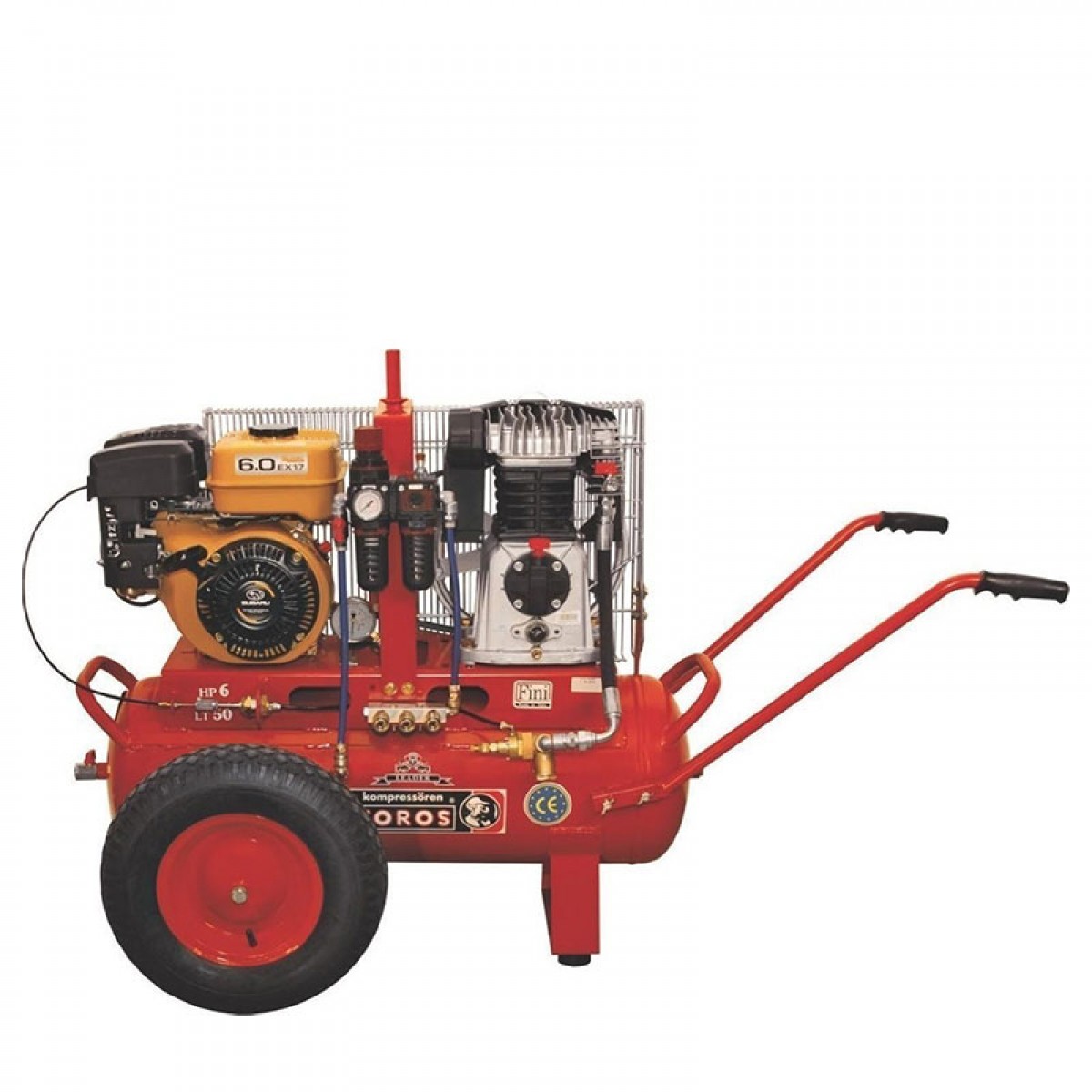 Ελαιολίπαντος δικύλινδρος, βενζινοκίνητος αεροσυμπιεστής με ιμάντα, ιδανικός για αγροτική χρήση. Η βενζινομηχανή είναι SUBARU Ιαπωνίας και η κεφαλή του είναι μαντεμένια της Ιταλικής FINI. Διαθέτει αυτόματο πιλότο, επιταχυντή στροφών, βάση για ανέμη, φιλτρορυθμιστή με λιπαντήρα, 3 λήψεις με ταχυσύνδεσμο, μανόμετρο γλυκερίνης, πρακτικές χειρολαβές και μεγάλες φουσκωτές ρόδες.